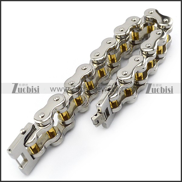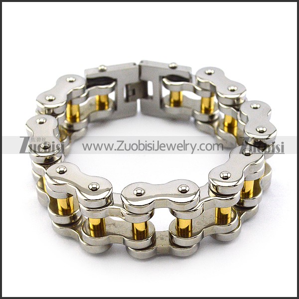 Silver Tone Motorcycle Chain Bracelet for Bikers in 25MM Wide with Golden Tube b005406