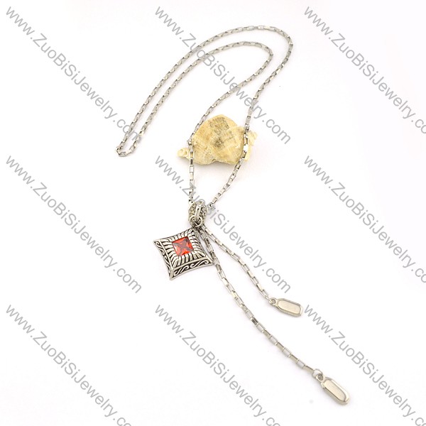 Zip Chain Necklace with Sliding Tab in Stainless Steel with Diamond Shaped Pendant sticky a Ruby-red Stone -n000237