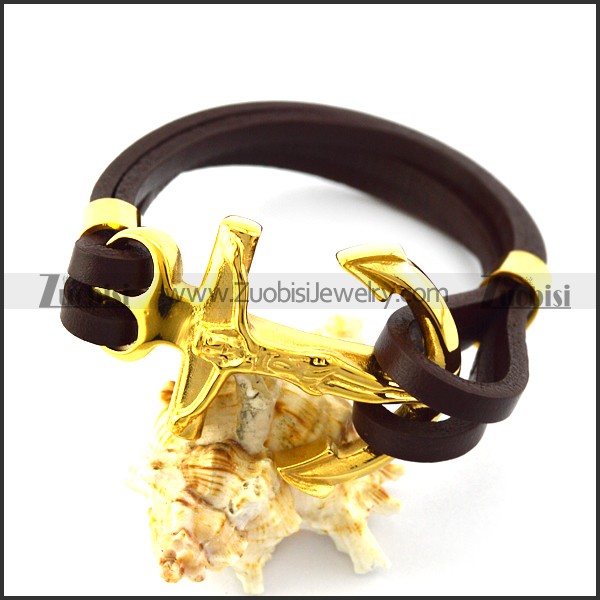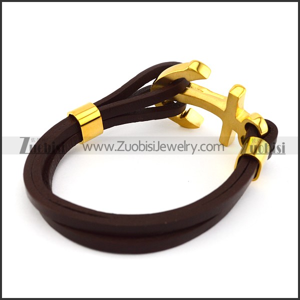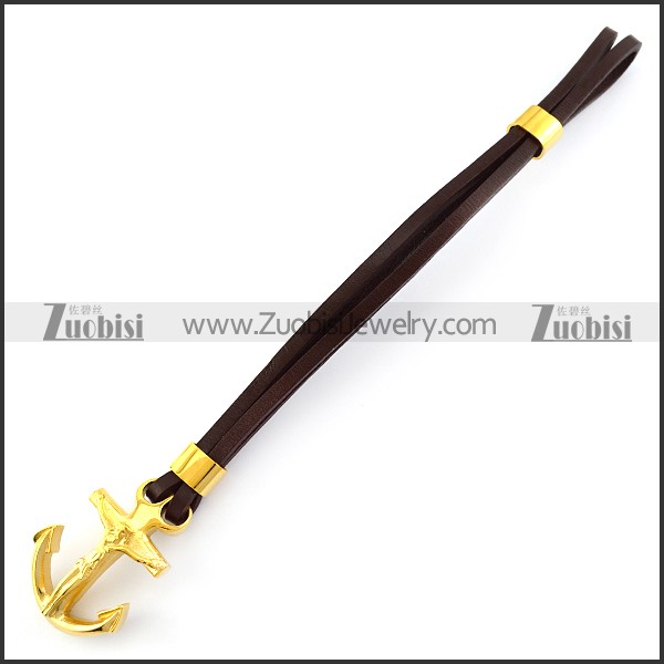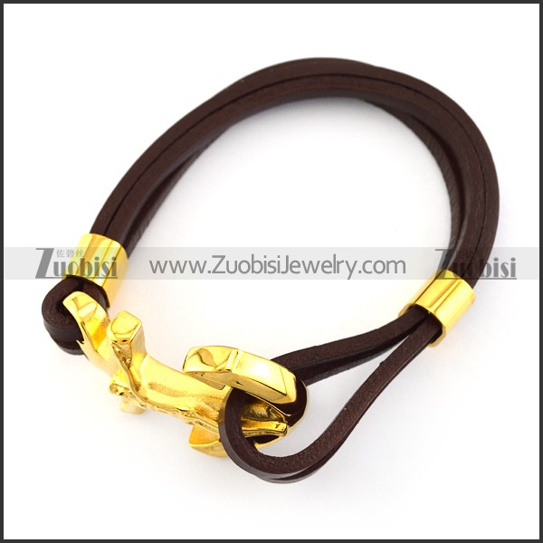 Brown Leather Bracelet with Golden Stainless Steel Jesus Anchor Buckle b006140