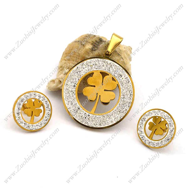 Clear Rhinestones Stainless Steel Clover Jewelry Set in Gold Tone s001221