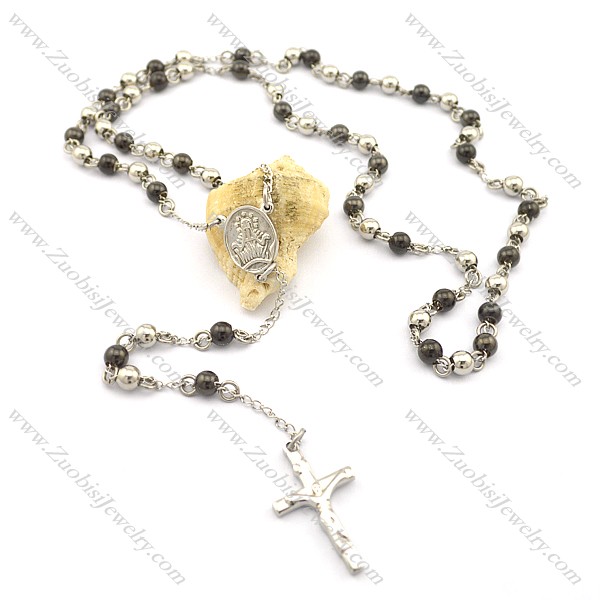 6mm black and steel tone rosary necklace with jesus cross n000725
