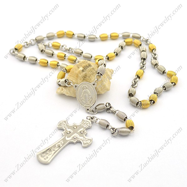 steel and gold tone spring bead rosary necklace with cross n000852