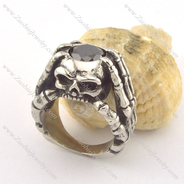 stainless steel skull ring with 1 big black faceted zircon r001354