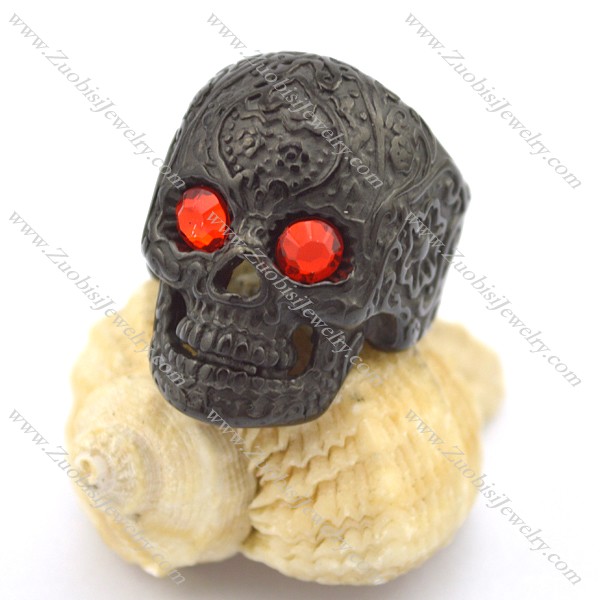 flame red eye black flower skull ring r002000