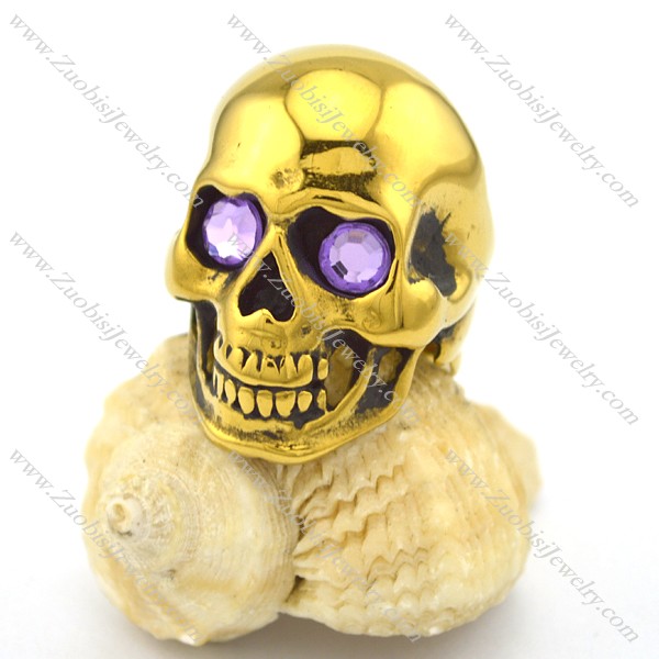Gold Skull Ring in Steel with Purple Rhinestone Eyes r002011