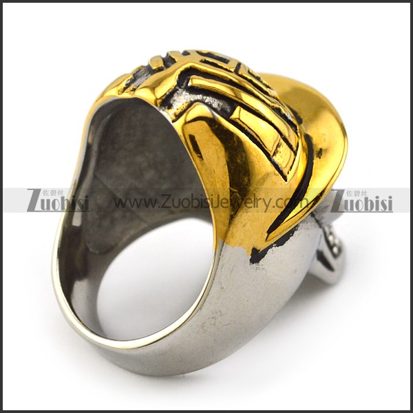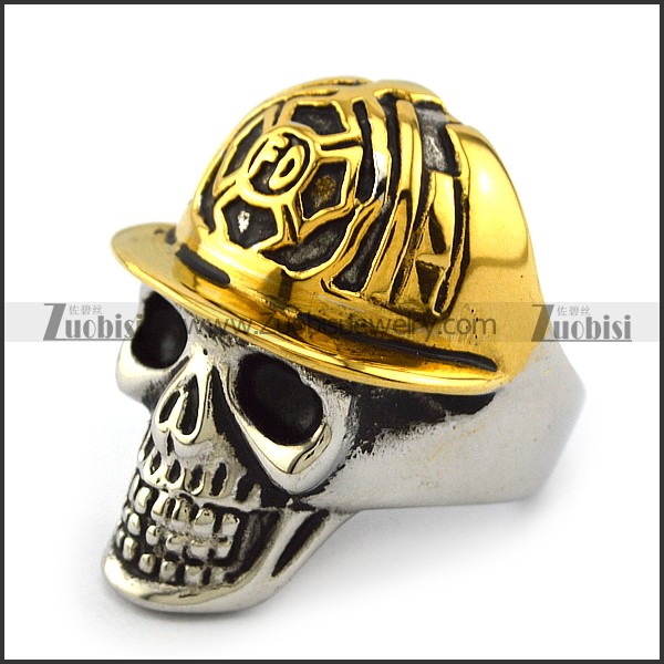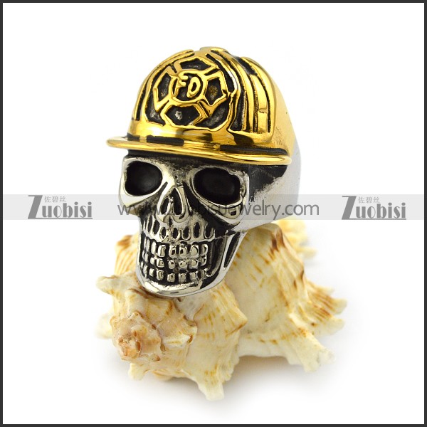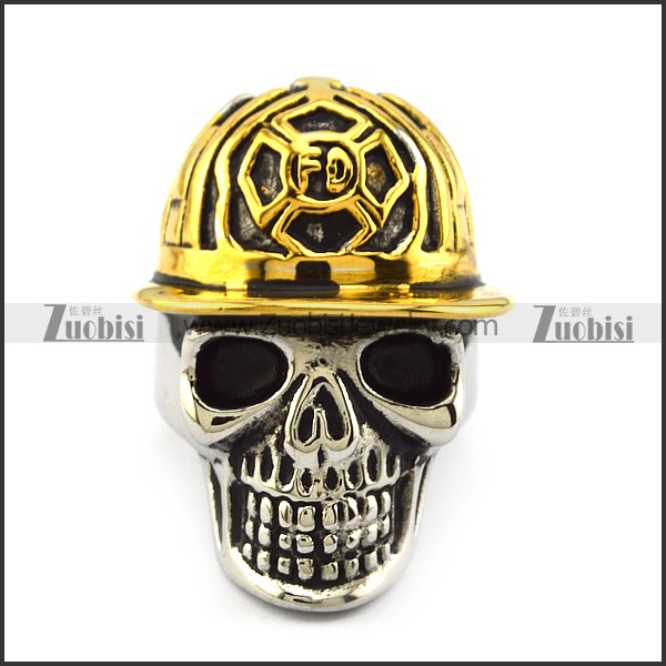 Stainless Steel Skull Ring wearing Gold Fireman Hat r003996