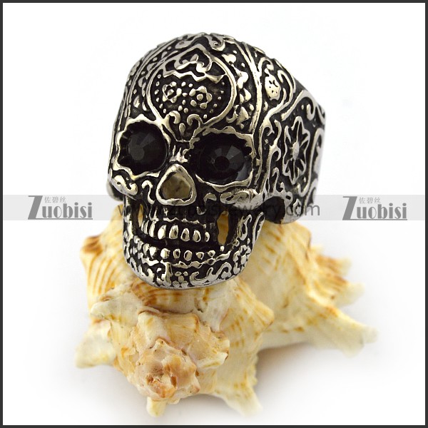 Dark Black Rhinestones Eyes Flower Skull Ring r004301