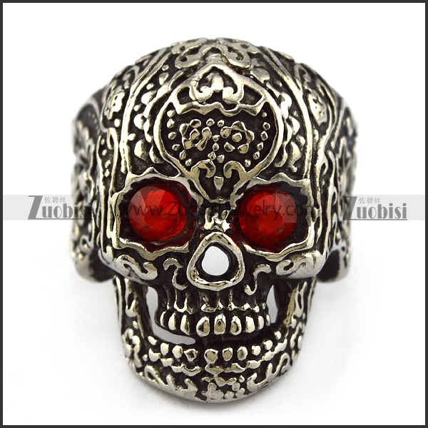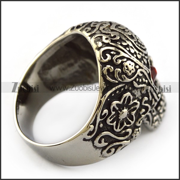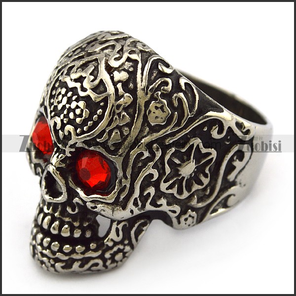 Dark Red Rhinestones Eyes Flower Skull Ring r004303