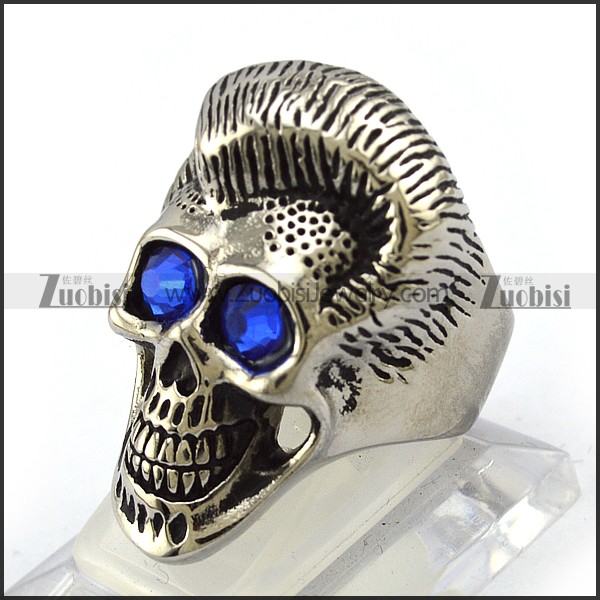 Silver Stainless Steel Handsome Skull Ring with Blue Rhinestones Eyes r004308