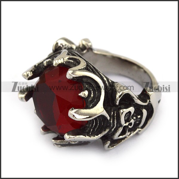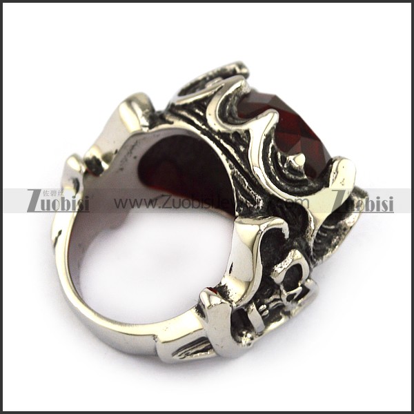 Stainless Steel Skull Engagement Ring with Clear Red Facted Stone r002705